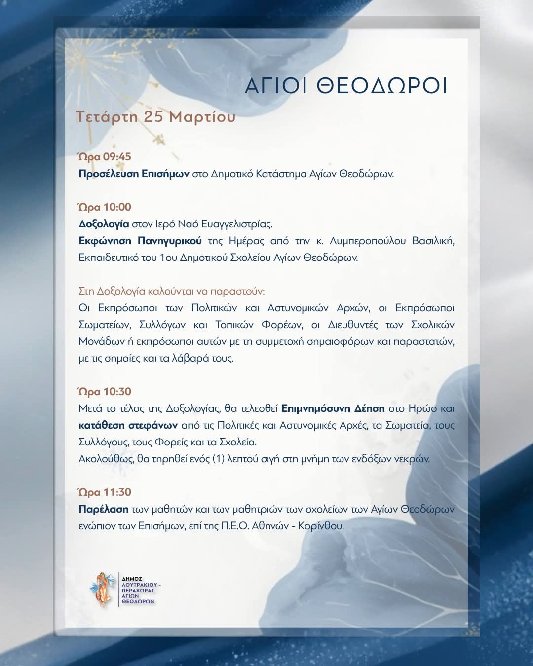 Η Επέτειος της 25ης Μαρτίου θα εορταστεί με τη δέουσα μεγαλοπρέπεια στην πόλη των Αγίων Θεοδώρων.