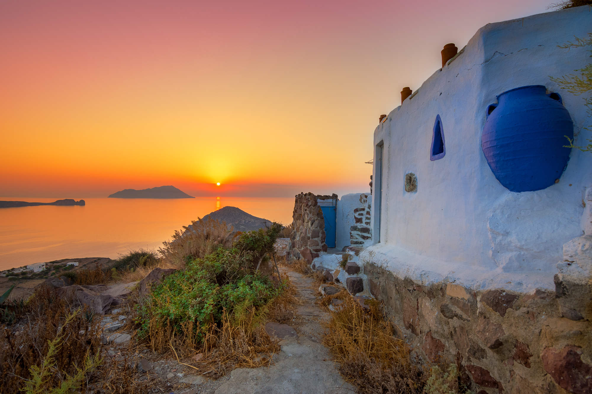 Λάβα, πετρώματα, βαθιά γαλάζια θάλασσα και σεληνιακά τοπία χαρακτηρίζουν ένα από τα πιο όμορφα και ίσως το πιο ρομαντικό νησί των Κυκλάδων. Στη Μήλο δε θα ξέρεις από πού να πρωτοαπολαύσεις το ηλιοβασίλεμα, είτε με το έτερον ήμισυ – με το οποίο λένε ότι επιβάλλεται να πας – είτε με την αγαπημένη σου παρέα. Όπου και αν επιλέξεις να δεις τη δύση του ηλίου ωστόσο, στο Κλίμα με τα υπέροχα σπιτάκια, το Σαρακίνικο με τα ηφαιστειογενή διαβρωμένα βράχια ή τη γραφική και κατάλευκη Πλάκα, παντού οι εικόνες είναι ανεπανάληπτες.