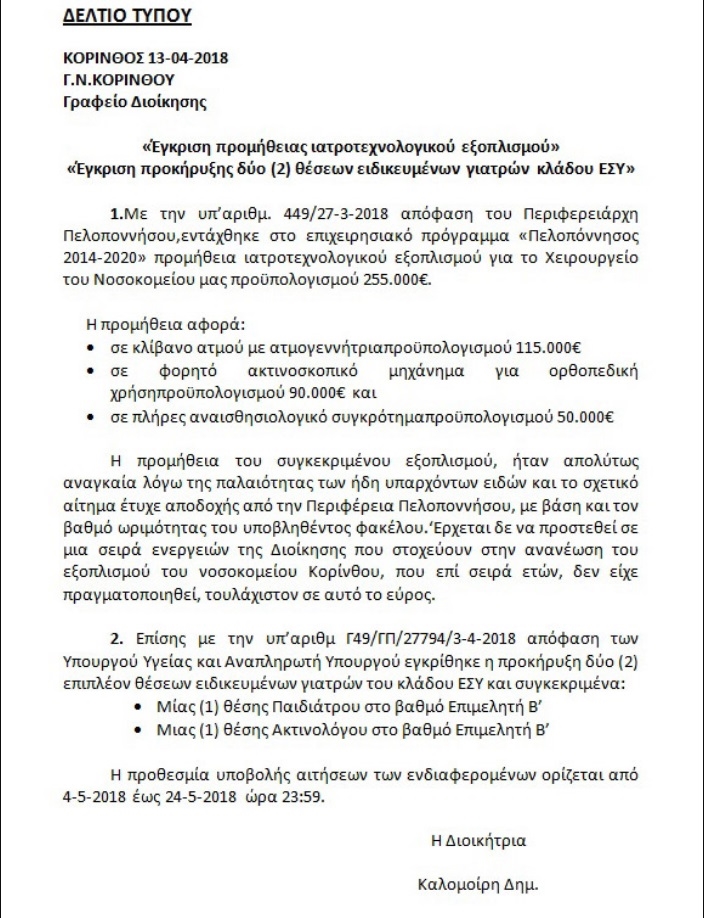 Αναγκαία η προμήθεια εξοπλισμού στο νοσοκομείο Κορίνθου 16 Απρ, 2018 | 08:20 By Εχετλαίος Δείτε το δελτίο τύπου: ΚΟΡΙΝΘΙΑΚΑemailfacebooklinkedintwittergoogle+pinterestredditwhatsappvk.comtumblrprint Ιστολόγιο του χρήστη Εχετλαίος Συντάκτης Εχετλαίος