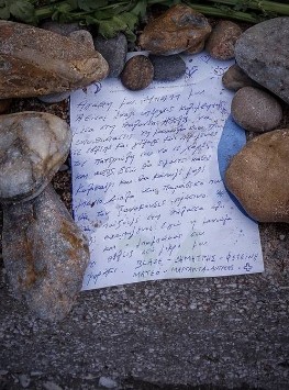 «Αγάπη μου, μπέμπη μου, είσαι ένας υπέροχος κολυμβητής μέσα στη θάλασσα. Ήθελες να εντυπωσιάσεις τη μανούλα σου, όπως κάθε φορά που σε έβλεπε και την έκανες χαρούμενη, όπως και περίμενες τον πατερούλη σου να σε χαρεί. Εδώ θα είμαστε κάθε καλοκαίρι και θα κάνουμε μαζί μπάνιο, δίπλα στον παράδεισο που θα τον ξανακάνεις πράσινο. Θα παίζουμε στη θάλασσα όλοι μαζί κι αγαπημένοι. Εγώ, η μανούλα σου και ο μπαμπάκας σου. Ότι θέλεις εσύ, μικρό μου ψαράκι. Δημήτρης, Φωτεινή, Μαργαρίτα, Ανδρέας», αναφέρει το σημείωμα.