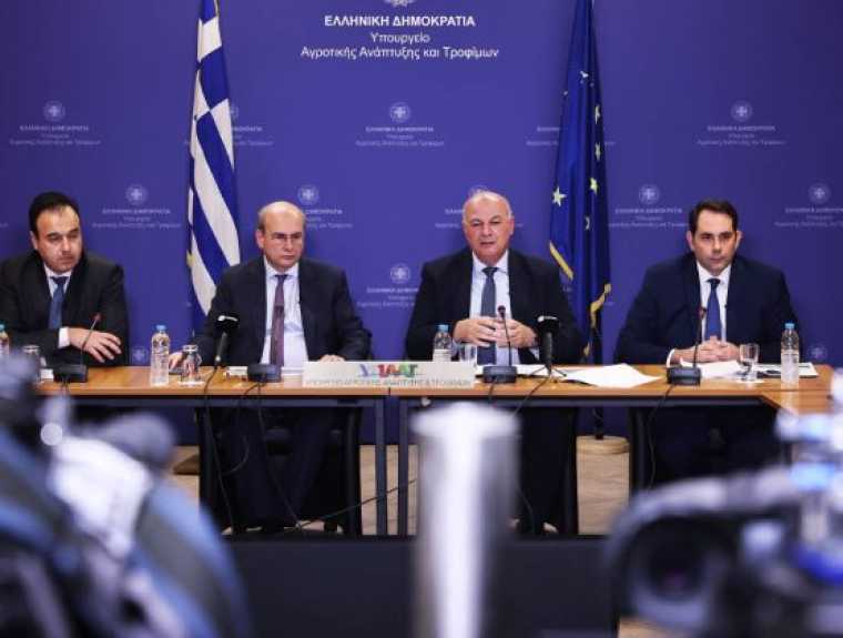 Τις κυβερνητικές παρεμβάσεις για τη στήριξη του πρωτογενούς τομέα παρουσίασαν ο αντιπρόεδρος της κυβέρνησης Κωστής Χατζηδάκης, ο υπουργός Αγροτικής Ανάπτυξης και Τροφίμων Κώστας Τσιάρας, ο υπουργός Ψηφιακής Διακυβέρνησης Δημήτρης Παπαστεργίου και ο υφυπουργός Εθνικής Οικονομίας και Οικονομικών Θάνος Πετραλιάς.