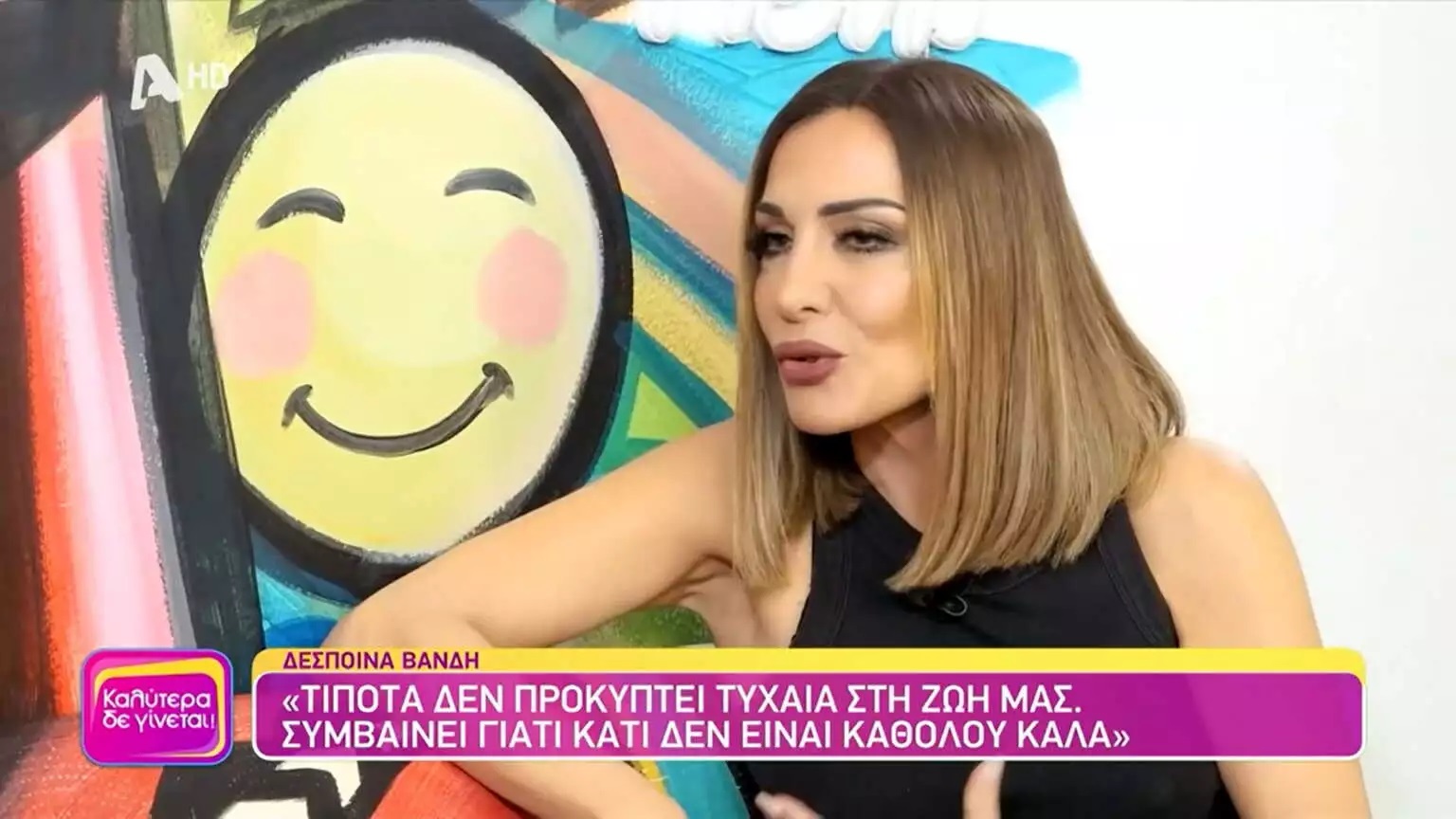 Η Εβελίνα Νικόλιζα και ο Παναγιώτης Ραφαηλίδης συνάντησαν την Δέσποινα Βανδή στο καμαρίνι της στο νυχτερινό μαγαζί που εμφανίζεται μαζί με το συγκρότημα Melisses. Η δημοφιλής τραγουδίστρια απάντησε στις ερωτήσεις τους σχετικά με την ζωή της δίπλα στον Βασίλη Μπισμπίκη και τις αλλαγές που έχει φέρει στη ζωή της και την καθημερινότητά της.