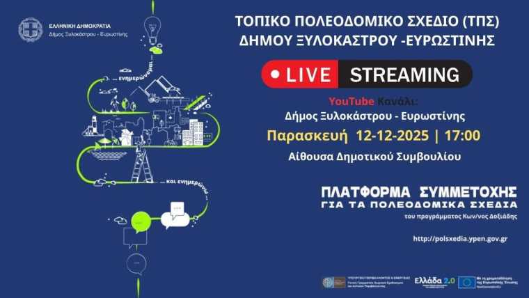 Ο Δήμος Ξυλοκάστρου – Ευρωστίνης και η Διεύθυνση Τεχνικών Υπηρεσιών & Περιβάλλοντος σας προσκαλούν την Παρασκευή 12/12/2025 στις 17:00, στην αίθουσα Δημοτικού Συμβουλίου στο Κέντρο Νεότητας Ξυλοκάστρου, για την παρουσίαση των εναλλακτικών σεναρίων του 1ου Σταδίου της μελέτης: