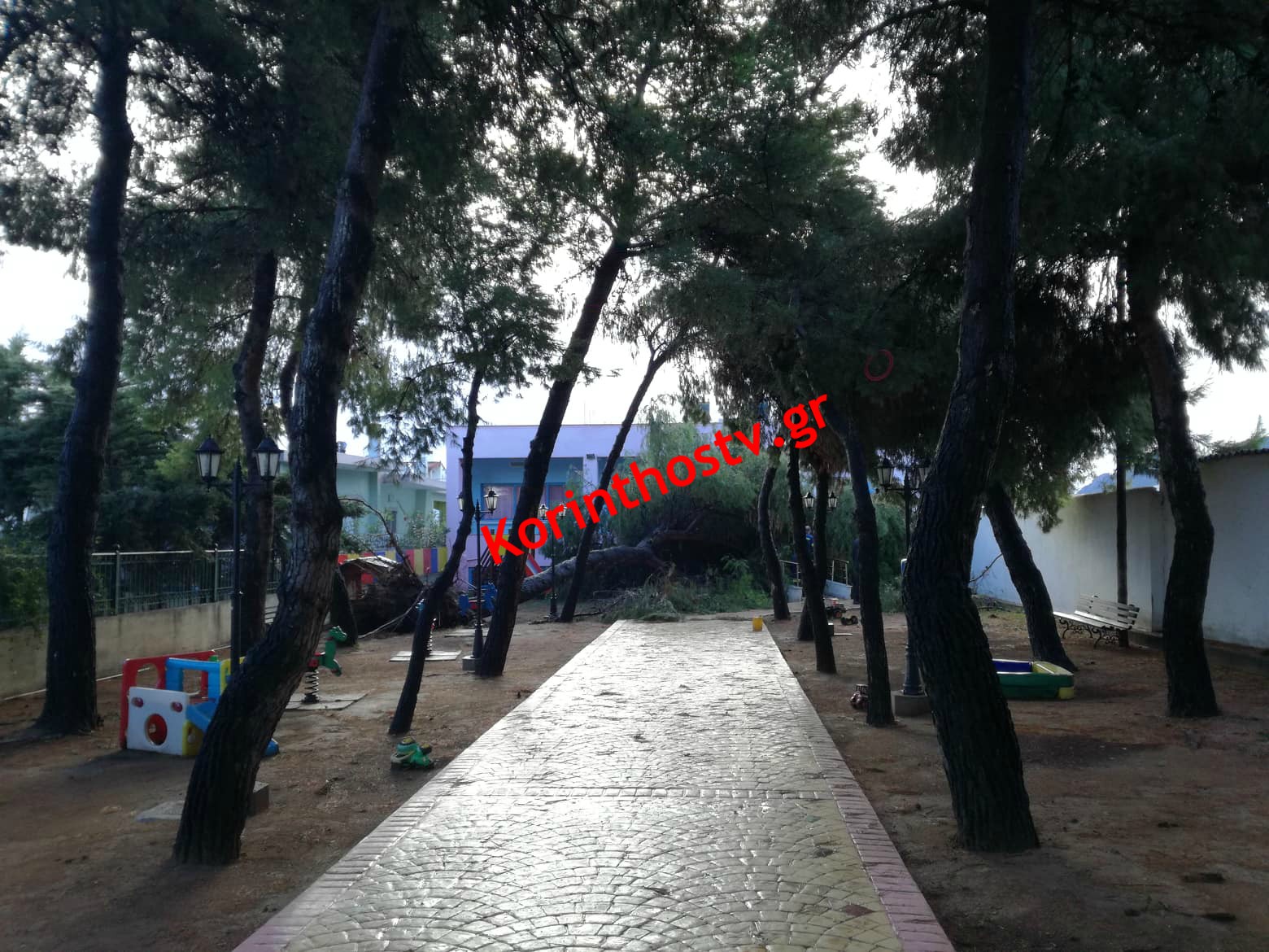 Ένα πανύψηλο πεύκο, το οποίο βρίσκονταν στο προαύλιο του Νηπιαγωγείου Εξαμιλίων στην Κόρινθο, ξεριζώθηκε εξαιτίας των ισχυρών ανέμων και έπεσε μπροστά στην είσοδο του Νηπιαγωγείου, χωρίς ευτυχώς να τραυματιστεί κανείς.