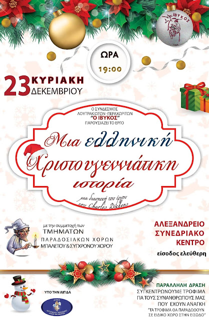 Τα μέλη και το Δ.Σ του Συνδέσμου Λουτρακιωτών – Περαχωριτών ο '' ΙΒΥΚΟΣ'' σας προσκαλούν την Κυριακή 23 Δεκεμβρίου 2018 και ώρα 19:00, στο Αλεξάνδρειο Συνεδριακό Κέντρο Λουτρακίου, όπου θα σας παρουσιάσουν "Μια Ελληνική Χριστουγεννιάτικη Ιστορία", μια διασκευή της κλασικής ιστορίας του Καρόλου Ντίκενς.