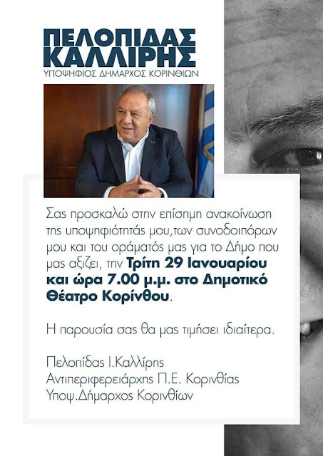 Ανοιχτό κάλεσμα στην εκδήλωση για την επίσημη ανακοίνωση της υποψηφιότητάς του για τον Δήμο Κορινθίων απευθύνει ο Αντιπεριφερειάρχης της Π.Ε. Κορινθίας Πελοπίδας Καλλίρης.