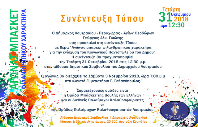 Θέμα της συνέντευξης ο "Αγώνας μπάσκετ φιλανθρωπικού χαρακτήρα για την ενίσχυση του Κοινωνικού Παντοπωλείου του Δήμου" που θα διεξαχθεί το  Σάββατο 3 Νοεμβρίου στις 7:00μ.μ. στο κλειστό γυμναστήριο Γ. Γαλανόπουλος.