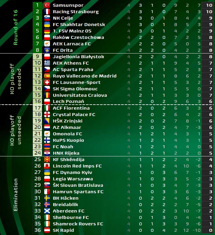 Το έργο της ΑΕΚ όμως είναι δύσκολο, αφού η Σαμσουνσπόρ βρίσκεται στην πρώτη θέση του βαθμολογικού πίνακα της League Phase του Conference League, με 10 βαθμούς μετά από 4 αγωνιστικές. Η μοναδική της βαθμολογική απώλεια ήρθε την περασμένη αγωνιστική, με το 2-2 στην έδρα της Μπρέινταμπλικ.