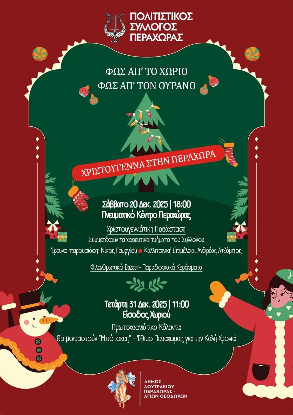 Η εορταστική εκδήλωση θα πραγματοποιηθεί το Σάββατο 20 Δεκεμβρίου στις 18:00 το απόγευμα στο Πνευματικό Κέντρο Περαχώρας.