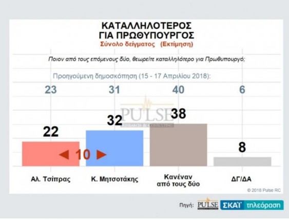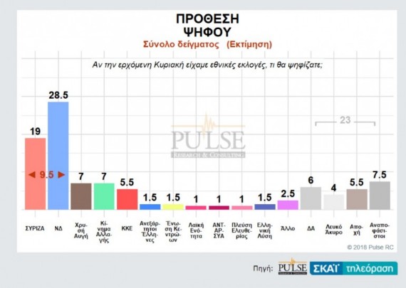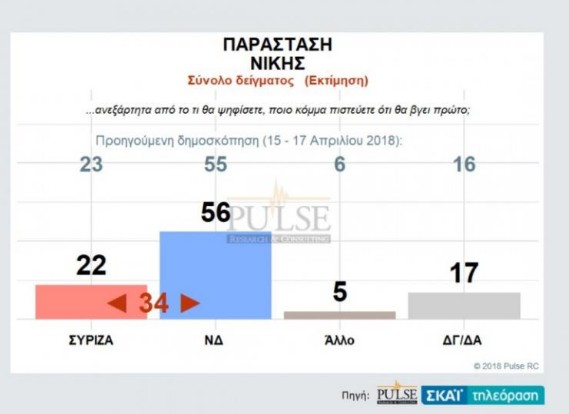 ψήφου, σύμφωνα με την πανελλαδική δημοσκόπηση της εταιρείας Pulse που διενεργήθηκε το διάστημα 13 με 15 Μαΐου 2018 σε δείγμα 1.341 ενηλίκων, για λογαριασμό του ΣΚΑΪ.