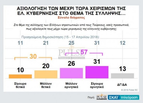 Ως προς το θέμα των δύο Ελλήνων στρατιωτικών που κρατούνται σε τουρκικές φυλακές της Αδριανούπολης, το 57% κρίνει αρνητικά ή μάλλον αρνητικά τους χειρισμούς της κυβέρνησης (56% τον Απρίλιο). Από την άλλη, το 30% επικροτεί τους κυβερνητικούς χειρισμούς στο θέμα αυτό.