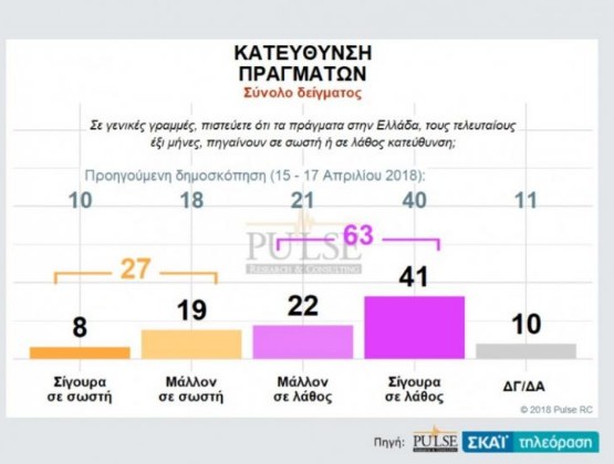 Τέλος, το 63% των πολιτών δηλώνει απαισιόδοξο που θεωρεί πως τα πράγματα στη χώρα μάλλον και σίγουρα πάνε σε λάθος κατεύθυνση. Το 27% δηλώσει πως η χώρα πάει στη σωστή κατεύθυνση.