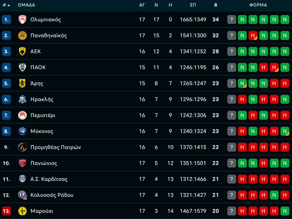 Το τριφύλλι έχει πλέον ρεκόρ 15-2 (8-0 εντός και 7-2 εκτός έδρας), μετά και την ήττα που υπέστη από τον Άρη Betsson την περασμένη εβδομάδα, ενώ η ομάδα του Νίκου Παπανικολόπουλου έπεσε στο 4-13 (4-5 εντός και 0-8 εκτός έδρας), παραμένοντας σε δυσμενή θέση.