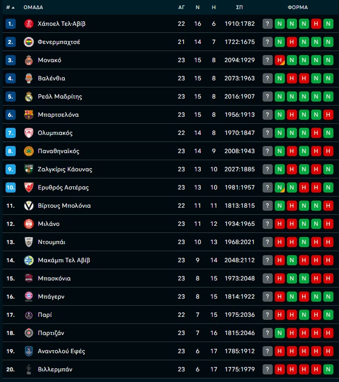 EuroLeague: Η βαθμολογία μετά τις νίκες Ολυμπιακού και Παναθηναϊκού