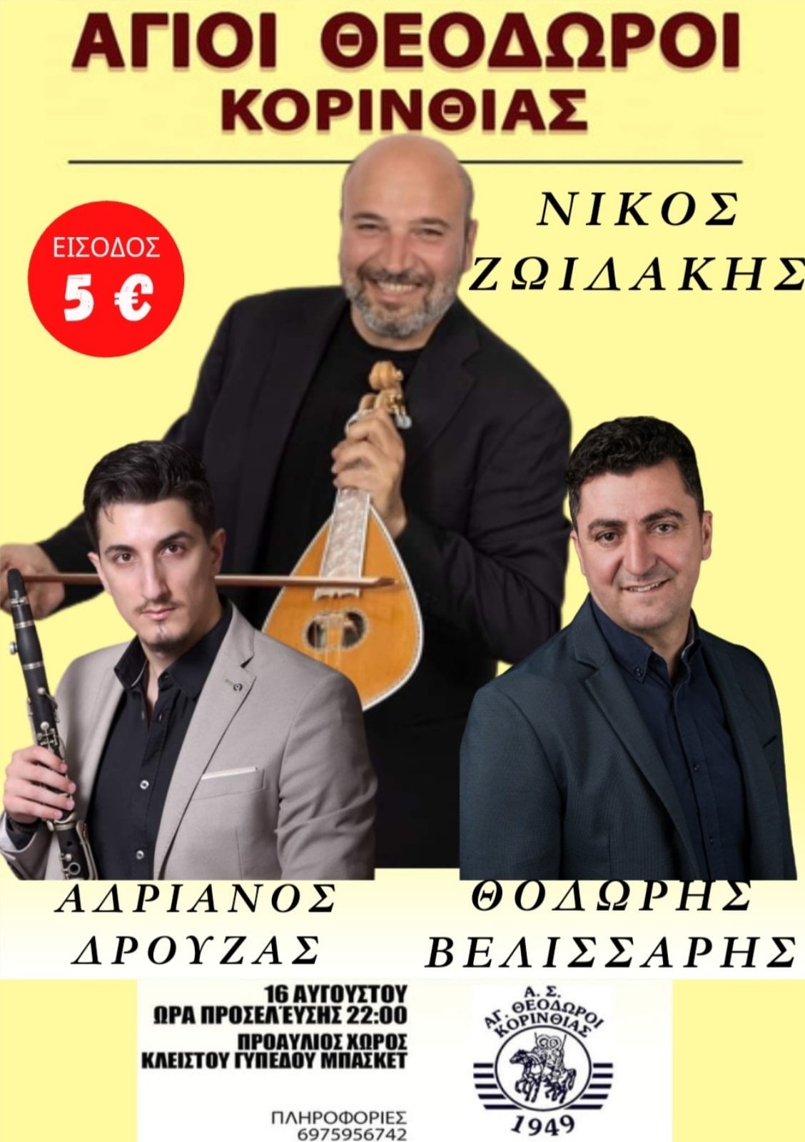Ο ΑΣ Άγιοι Θεόδωροι Κορινθίας, διοργανώνει παραδοσιακή βραδιά στον Προαύλιο χώρο του κλειστού γηπέδου μπάσκετ, σήμερα Τετάρτη 16 Αυγούστου με τη συμμετοχή του Νίκου Ζωιδάκη...