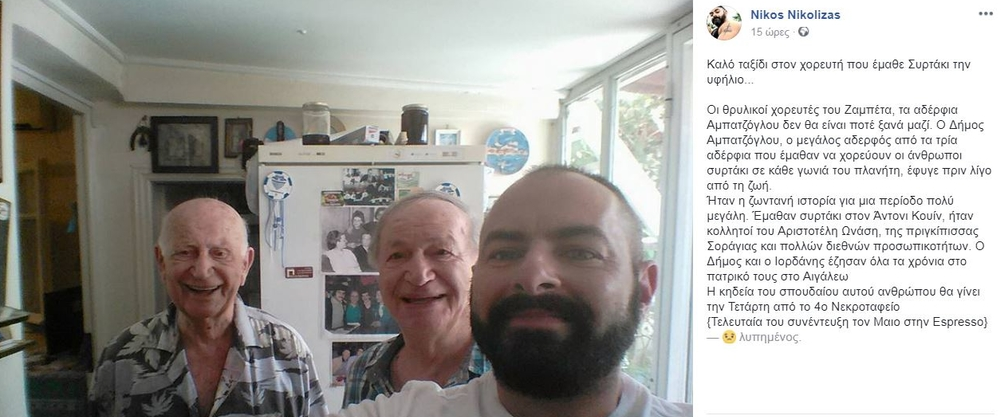 Την είδηση του θανάτου έκανε γνωστή ο Νίκος Νικόλιζας, ο οποίος έγραψε στον προσωπικό του λογαριασμό στο facebook: «Καλό ταξίδι στον χορευτή που έμαθε Συρτάκι την υφήλιο…»