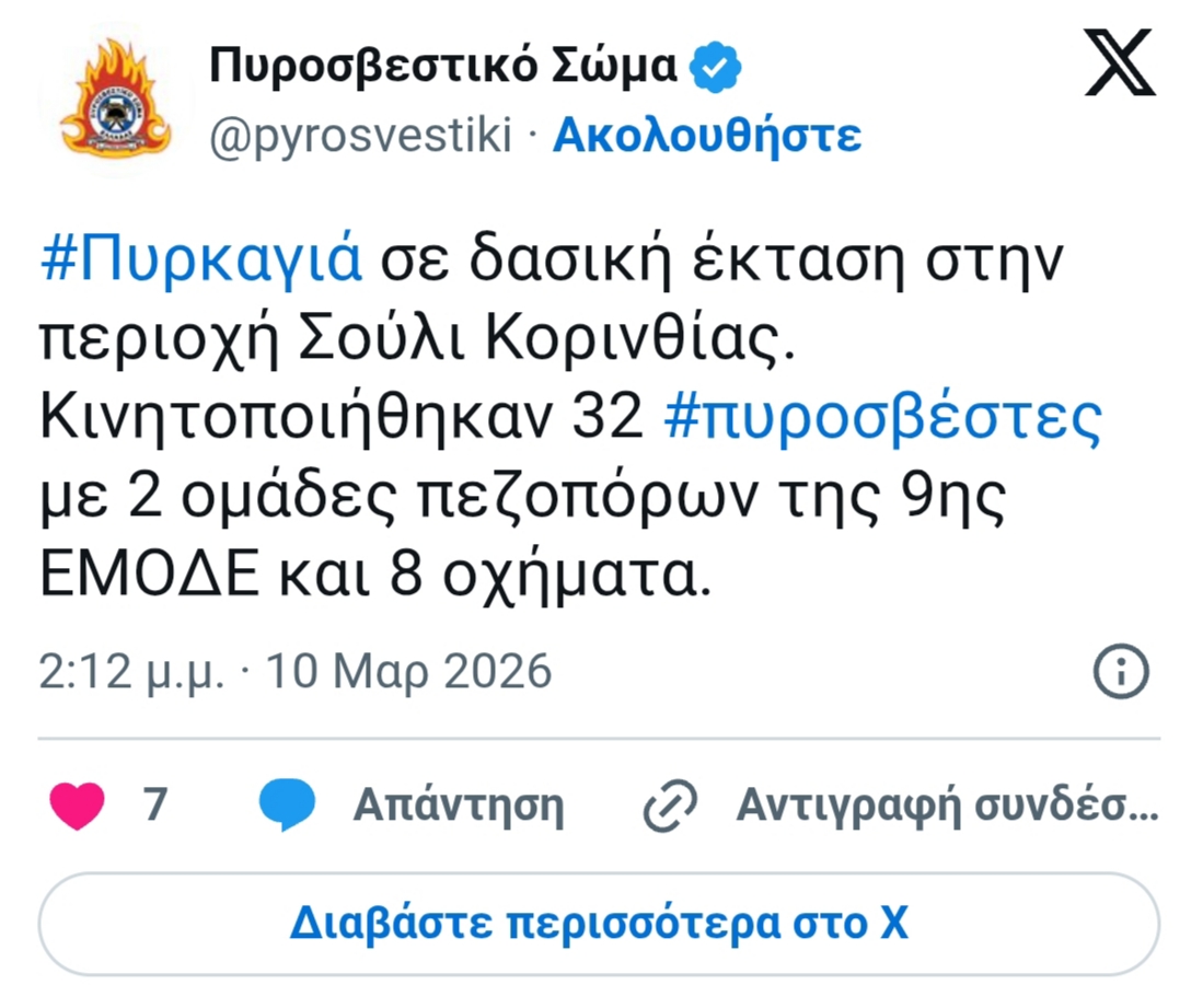 Πυρκαγιά ξέσπασε πριν από λίγα λεπτά σε δασική έκταση στην περιοχή Σούλι Κορινθίας.
