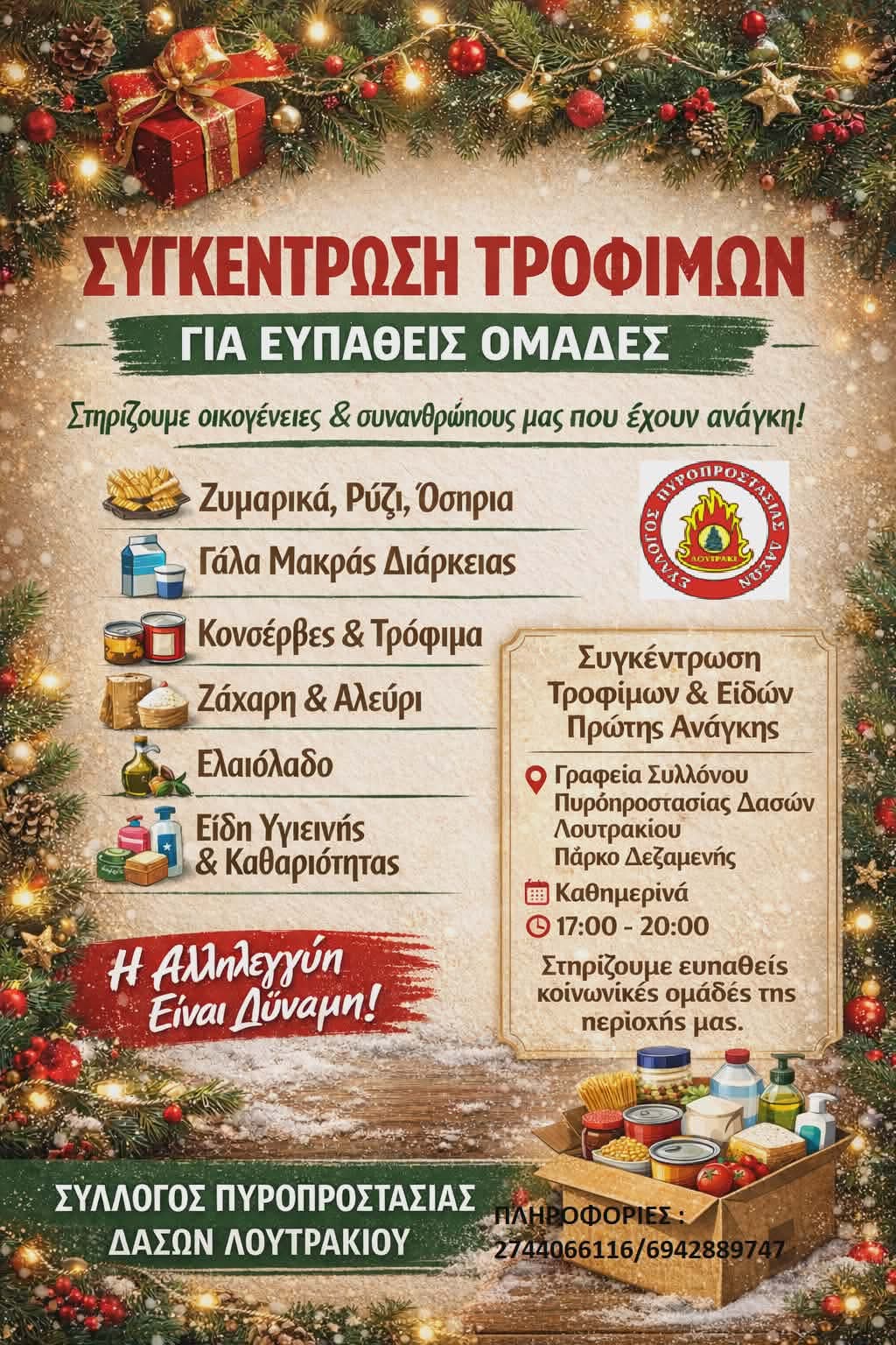 Σύλλογος Εθελοντών Πυροπροστασίας Δασών Λουτρακίου Περαχώρας, οργανώνει συλλογή τροφίμων μακράς διάρκειας και ειδών πρώτης ανάγκης για τη στήριξη οικογενειών της περιοχής μας που αντιμετωπίζουν δυσκολίες.