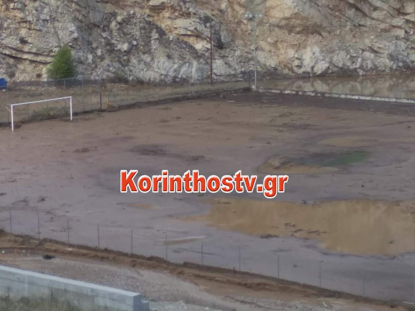 Σε λίμνη έχει μετατραπεί το γήπεδο στο Σολωμό Κορινθίας καθώς οι ζημιές που έχουν προκληθεί από το χθεσινό κύμα κακοκαιρίας είναι τεράστιες.